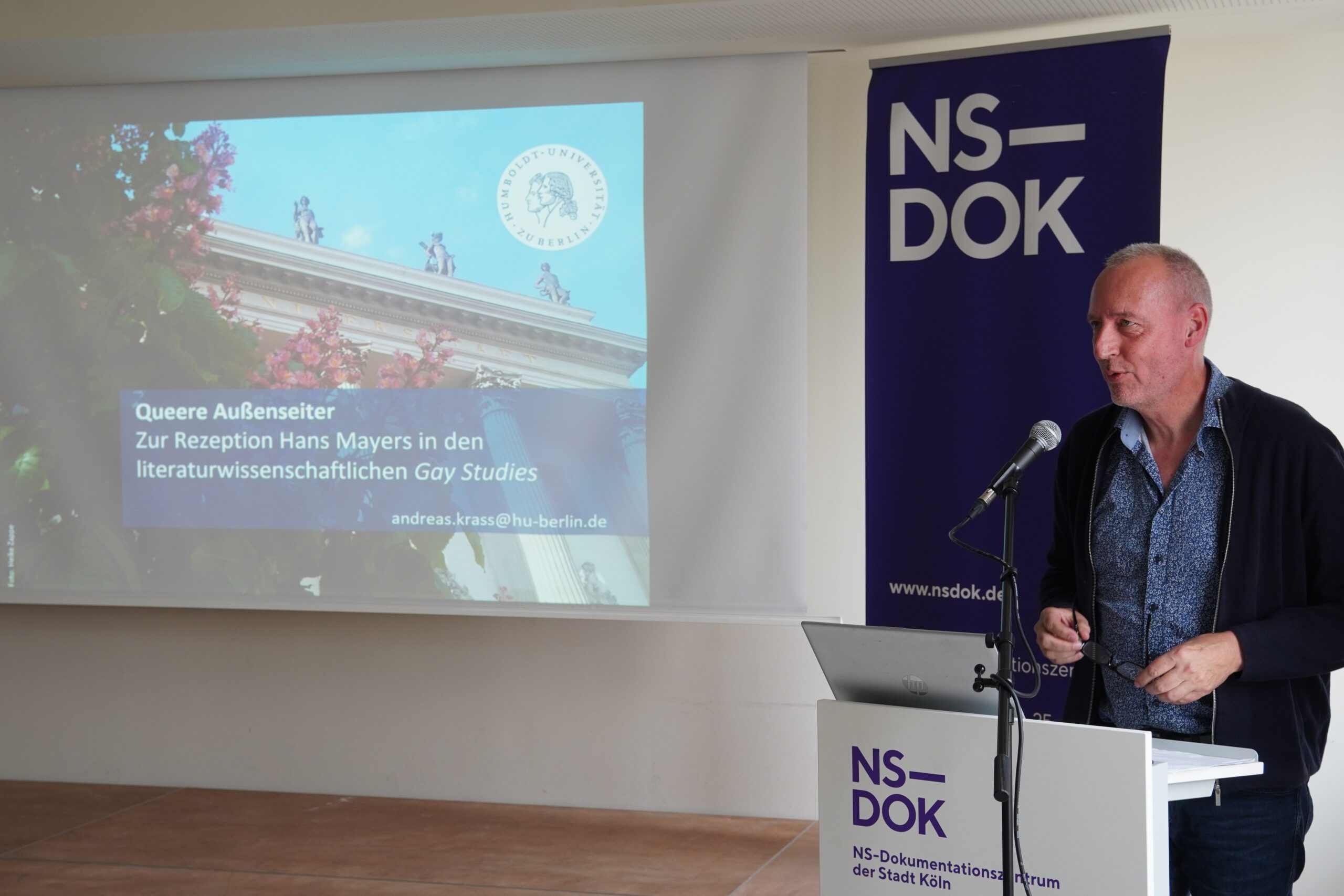 Einen Einblick in die Rezeption Mayers in den Gay Studies bot der Vortrag von ANDREAS KRAß (Berlin). Zunächst zeichnete er die Geschichte des Paragraphen 175 nach, der von 1872 bis 1994 in verschiedenen Versionen Anwendung fand. Da der Paragraph in der Fassung des Kaiserreichs von der DDR und in der des Nationalsozialismus von der Bundesrepublik übernommen wurde, erlebte Hans Mayer, der 2001 starb, als homosexueller Mann all diese Fassungen sowie die Abschaffung des Paragraphen mit. Vor diesem Hintergrund erkannte er in Homosexualität nicht nur ein individuelles, sondern auch ein politisches Thema. Mayer gehörte einem humanistisch-liberalen Diskurs an, der Homosexualität sexualwissenschaftlich betrachtete und im Kontrast stand zu einem maskulinistisch-konservativen Diskurs, der Homosexualität als gesteigerte Männlichkeit und somit aus einem antifemininen und antisemitischen Blickpunkt betrachtete. Gleichwohl sei Außenseiter in den Gay Studies lange kaum beachtet worden. Zwar sei Mayer in den 1990er Jahren stellenweise zitiert worden, eine substanzielle Auseinandersetzung blieb jedoch aus. Kraß erklärte dies damit, dass Mayer durch seine stark historisch-literaturwissenschaftliche Perspektive in einem methodischen Feld verortet sei, das sich nur bedingt mit poststrukturalistisch geprägten Ansätzen verbinden lasse.